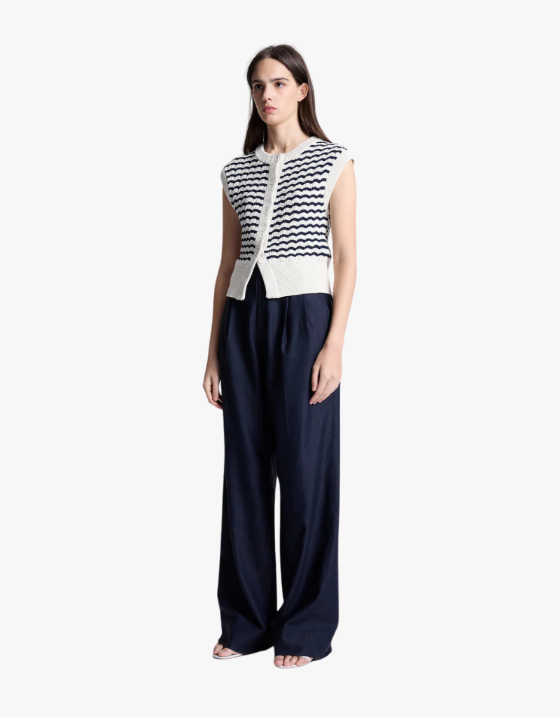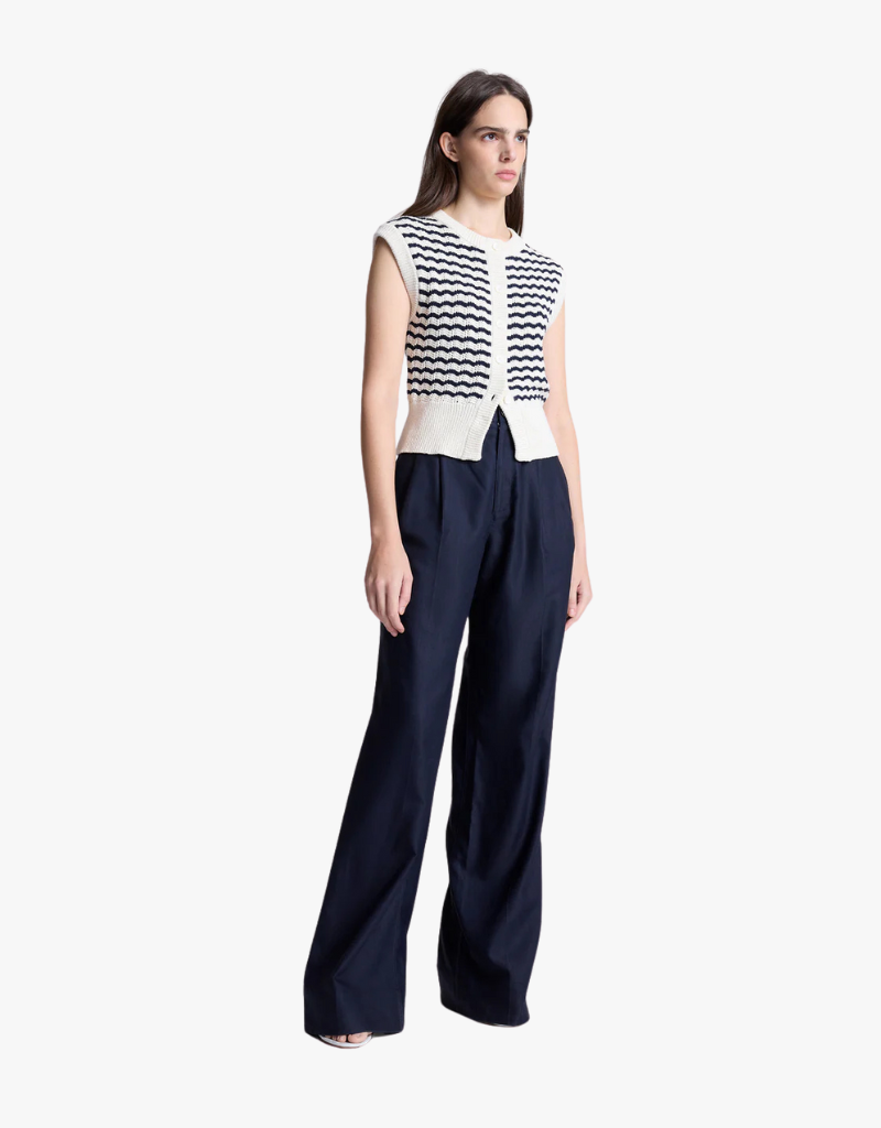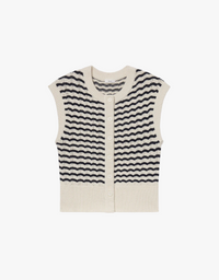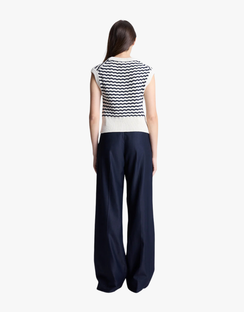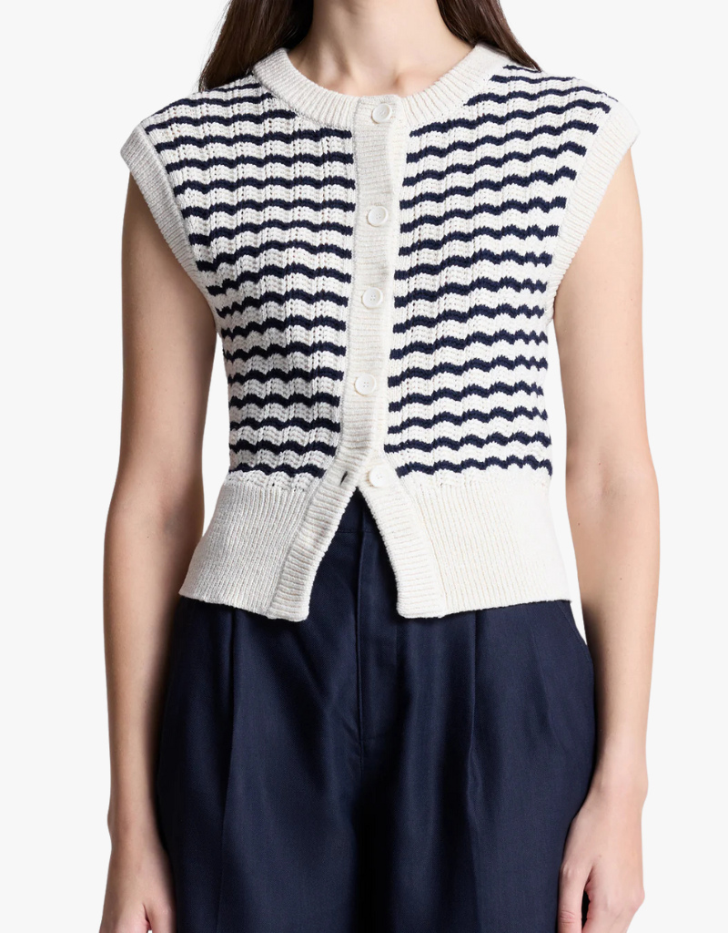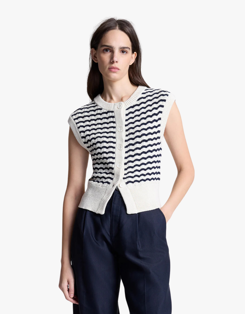 The Margo Striped Knit Top is crafted from soft, structured cotton chainette yarn in a parchment and navy stripe. This sleeveless, hip-grazing silhouette features a rounded neckline and white ribbed detailing for contrast.