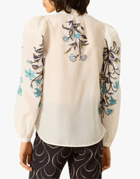 The Annabel shirt features a '70s-inspired silhouette with puff shoulders and a ruffled collar. Crafted from a cotton-silk blend, the design showcases an intricate floral motif across the chest and sleeves. Han Inspired by '70s style, this cotton-silk shirt features puff shoulders and a ruffled collar. Hand-block printing creates unique variations in the floral motif. block printing creates unique dye and pattern variations that highlight the artisanal nature of the textile.