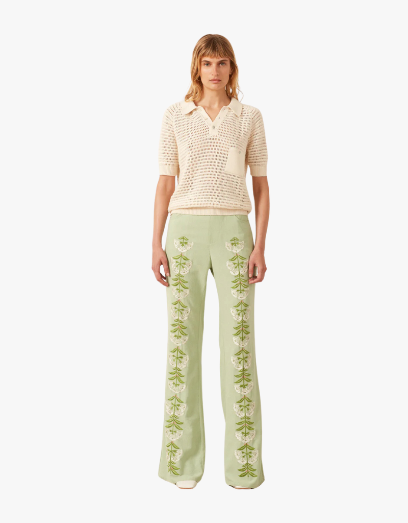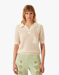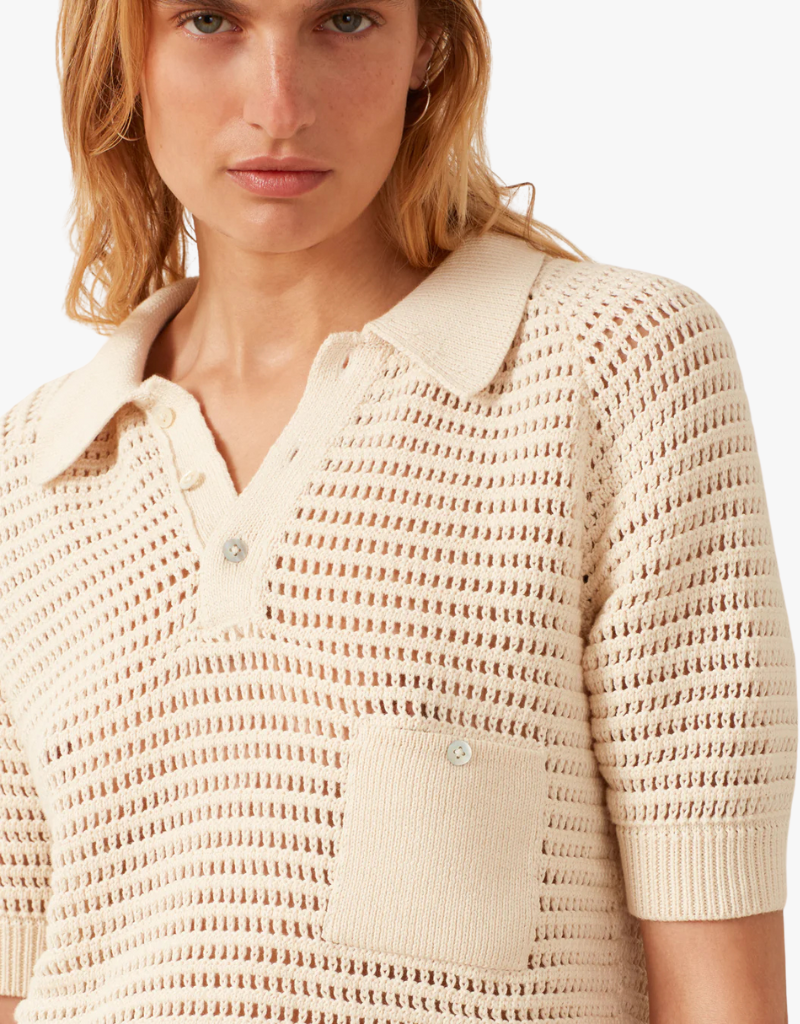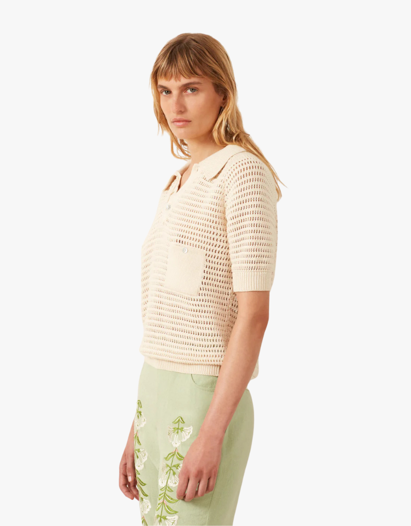 The Lesis Crochet Top is skillfully crafted from soft cotton, boasts a charming patch pocket and sleek mother-of-pearl buttons. Elevate your wardrobe with this vintage-inspired top and pair it effortlessly with high-waisted trousers for a timeless look.