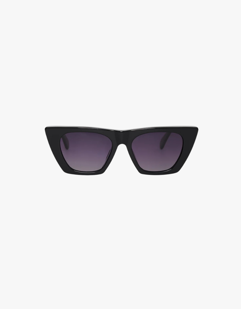 The Paris Sunglasses boast an angular square shape, black acetate frames, and black gradient lenses, polarized with UV400 protection. Gold-tone branding accents the left arm for a stylish touch.