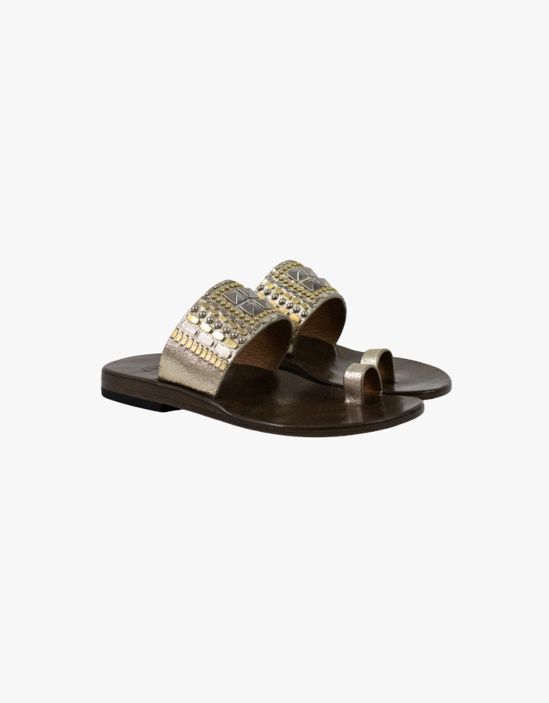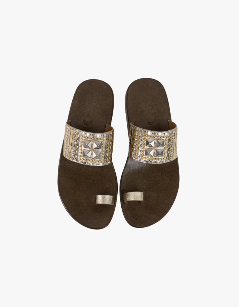 The Kenji Sandal features hand-studded brass and nickel artwork, blending comfort and artistry. Made from premium leather with built-in arch support, it's perfect for casual and evening wear.