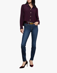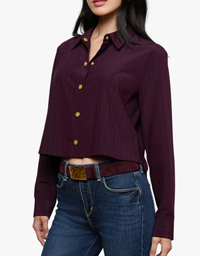 This classic tailored shirt features a relaxed, borrowed-from-the-boys fit accented with gold-tone coin buttons for a hint of glamour. Reintroduced in a rich dark burgundy with subtle pinstripes, it offers a polished yet modern feel. A cropped length and high-low hem complete the contemporary silhouette.