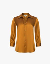A classic button-down blouse with a luxurious, light-catching luster. Charmeuse silk drapes effortlessly to a shorter, curved hem. Three-quarter-length sleeves and a relaxed open collar balance elegance with wearability. 100% silk.