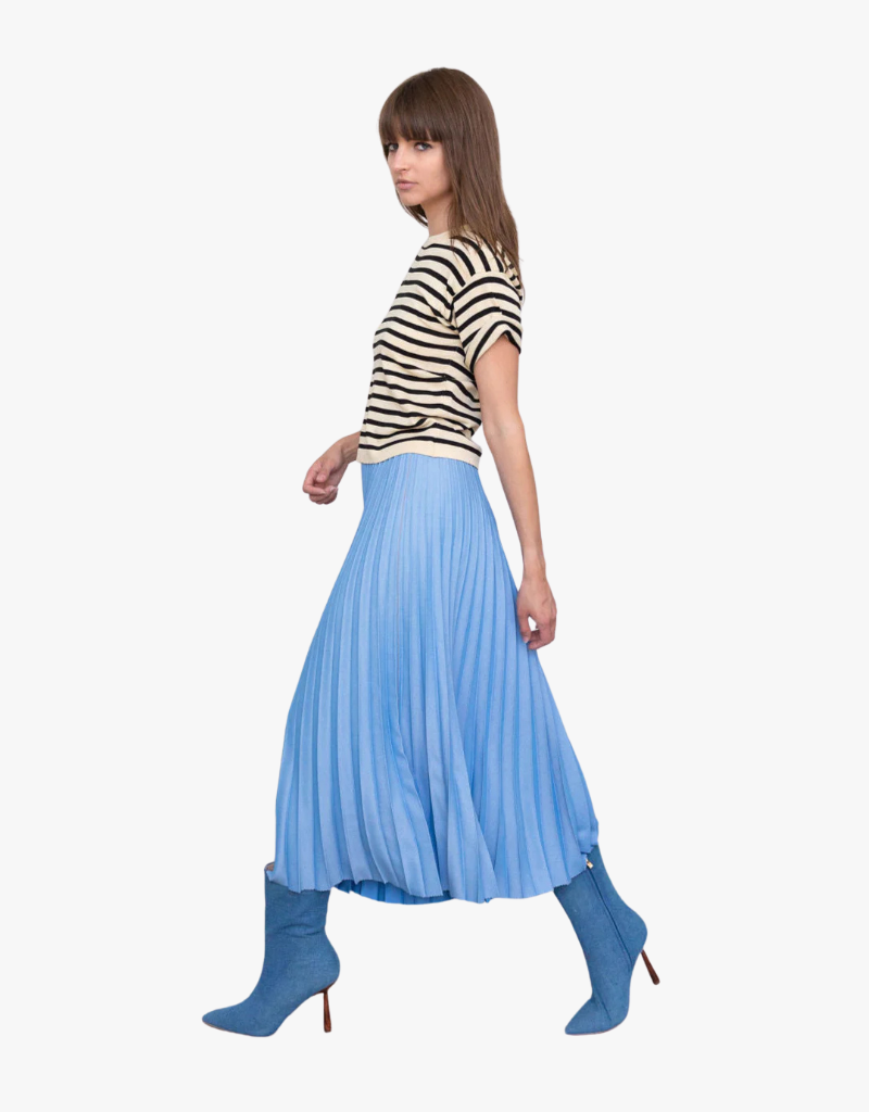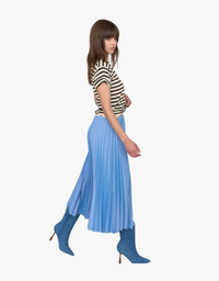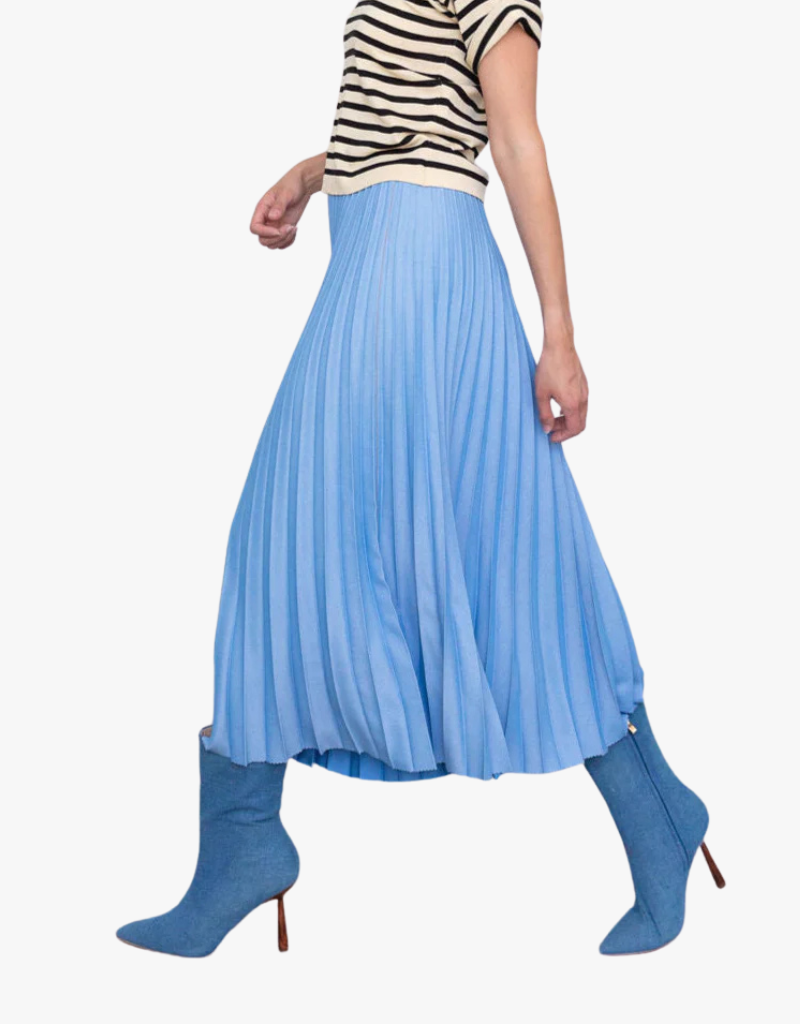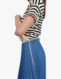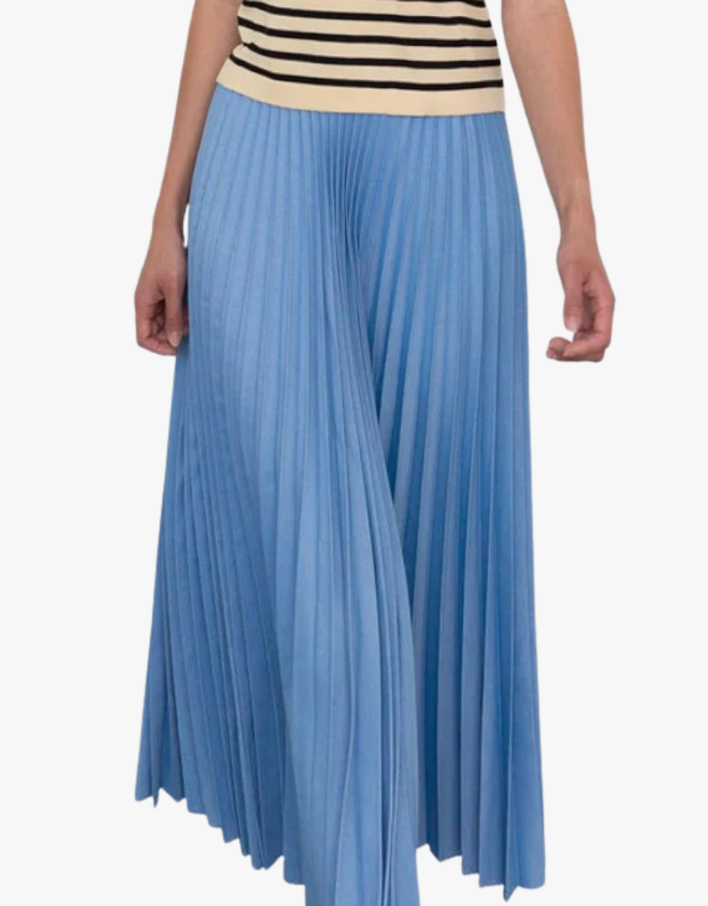 This pleated skirt, made from Japanese denim, showcases salvage detail stitching along the side seams and a raw, unfinished hem. Woven from medium-weight rayon, it offers a perfect blend of comfort and elegance.