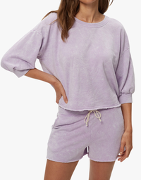 The Julia Elbow Puff Sleeve Pullover by Michael Stars is crafted in mineral wash terry for a relaxed, lived-in look. Elbow-length puff sleeves and a distressed hem add subtle edge to this easy everyday layer.