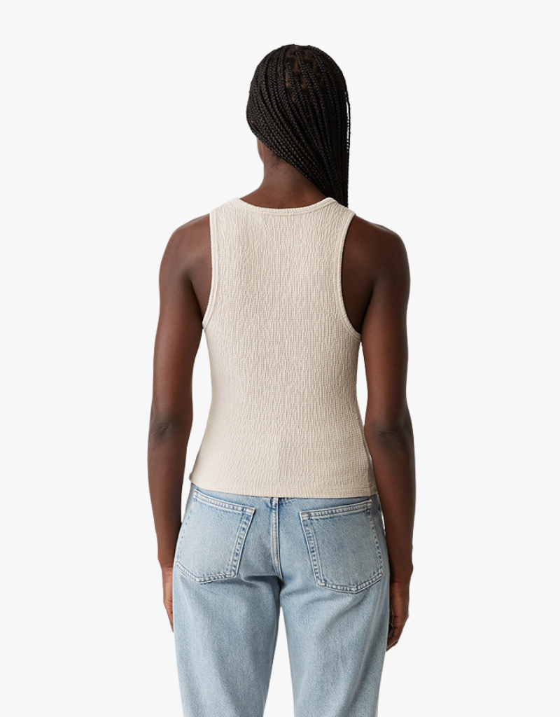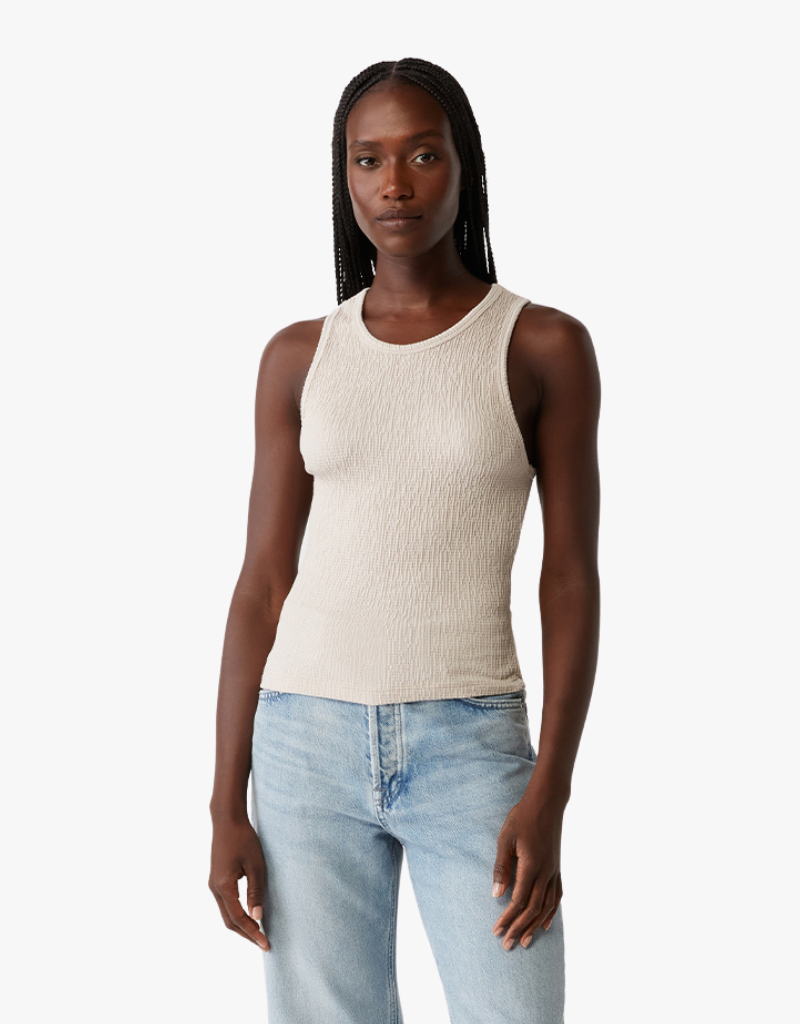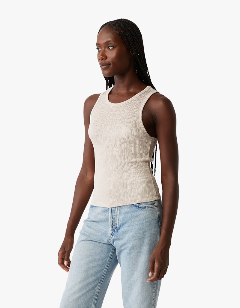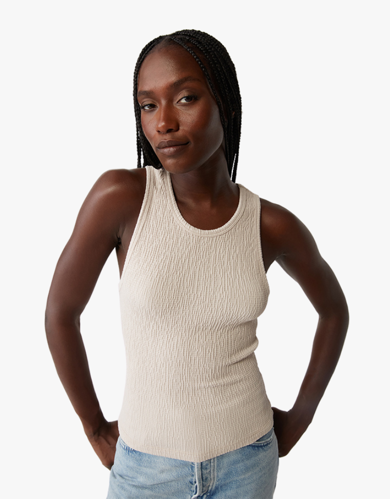 Elevate your wardrobe with the Kira Easy Tank Top. Featuring a unique crinkle texture, this updated classic brings a fresh, modern twist to your essentials. Don't miss out on this must-have piece!