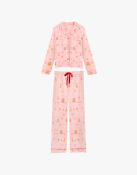 This Western-inspired pajama set is crafted from soft cotton-modal jersey for an easy, comfortable feel. A relaxed button-down top with contrast piping pairs with full-length drawstring pants, finished with playful motifs for cozy lounging and sleepwear styling.