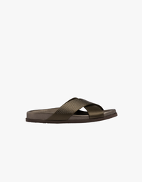 These glamorous slip-on sandals feature wide, olive-toned crossed straps, one embellished with delicate studs, set atop a comfortable dark sole for a chic and relaxed look. Add this versatile, studded sandal to your collection now!