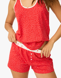 This charming two-set pajama gift box features a delightful strawberry print set and a classic polka dot set, both designed in a breezy tank-and-short silhouette. Each pair is finished with an elastic waistband for effortless comfort and a perfect fit—shop the ultimate lounge gift box today.