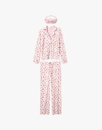 Experience ultimate relaxation in this three-piece set featuring a classic long-sleeve button-down and adjustable drawstring pants. Shop today to complete your cozy routine with the included matching eye mask!