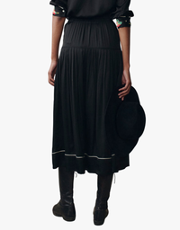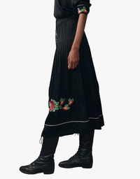 Cut from fluid viscose with exquisite drape, this skirt features embroidered western roses and contrast piping for a fresh seasonal update. The dropped waist and flowy hem nod to nostalgia, while the elastic waist and full snap front offer effortless wear. A perfect blend of heritage and ease—add it to your wardrobe today.