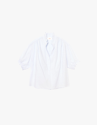 The Cam top receives a new season update, crafted from classic, lightweight cotton poplin for a perfect lived-in feel. This easy popover features a charming ruffled V-neck and sleeve cuffs, subtle back pleats, and a stylish high-low shirttail hem.