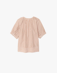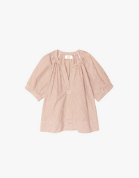 Introducing the Josette top in Nutmeg, a fresh addition this season featuring vibrant multicolor stripes in breathable cotton. Drawing inspiration from our popular Jules blouse, Josette offers a feminine touch with its gathered V-neckline, voluminous bubble sleeves, and elegant buttoned cuffs. Elevate your wardrobe with this stylish and comfortable piece.