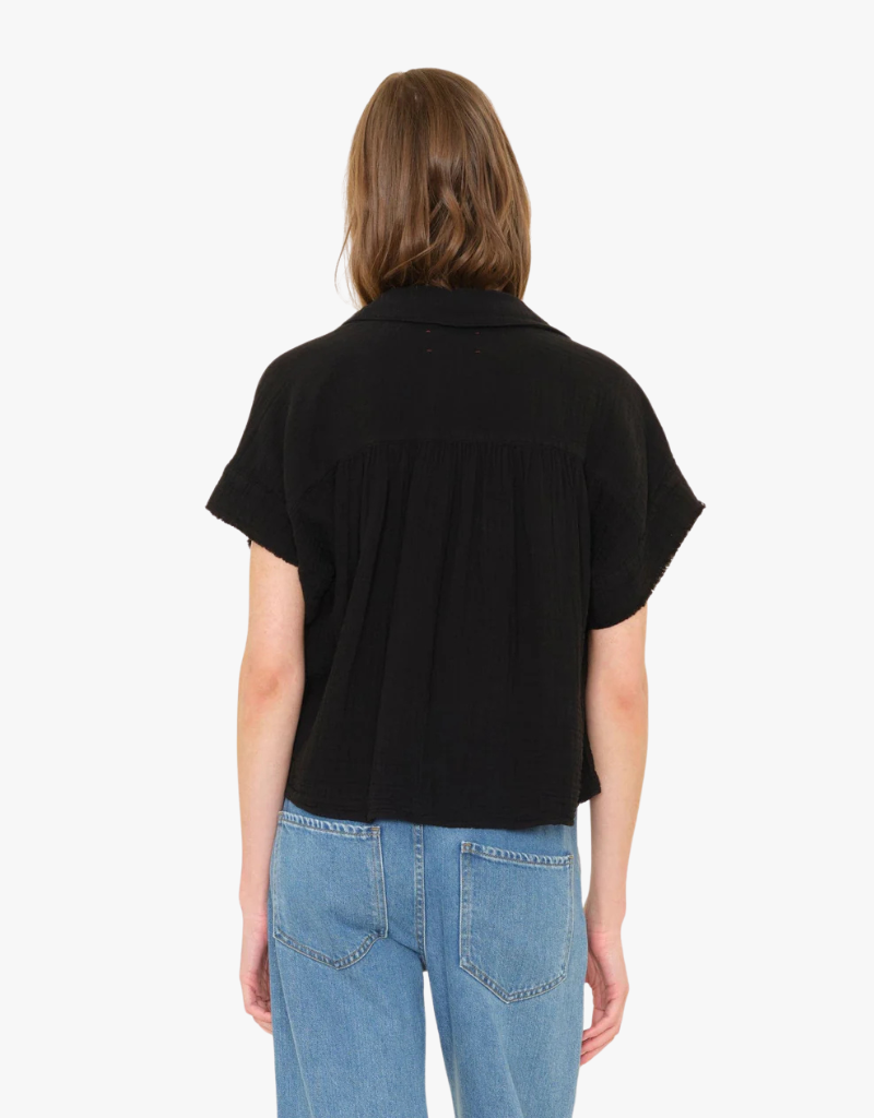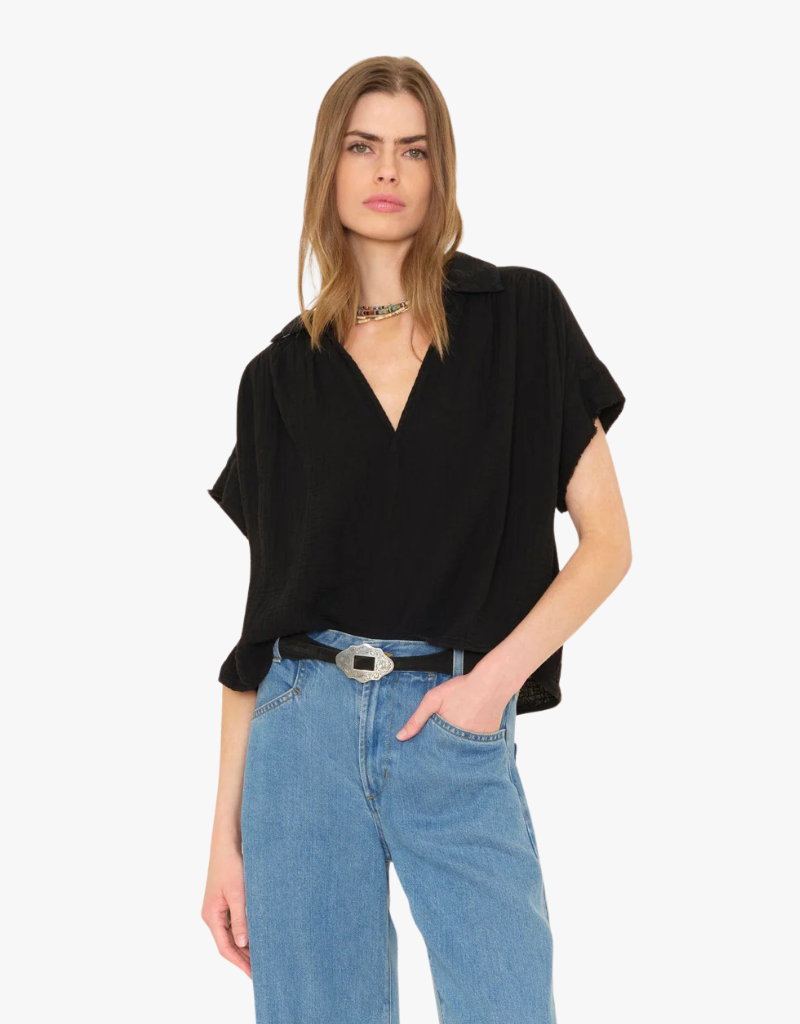 Refresh your style with the Reggie Top! Made from soft, crinkled washed double-faced cotton gauze, this cropped pullover features raw edge sleeves, a split neck, and shirred yokes. Order now for a chic look!