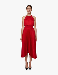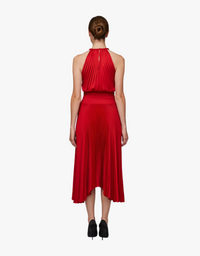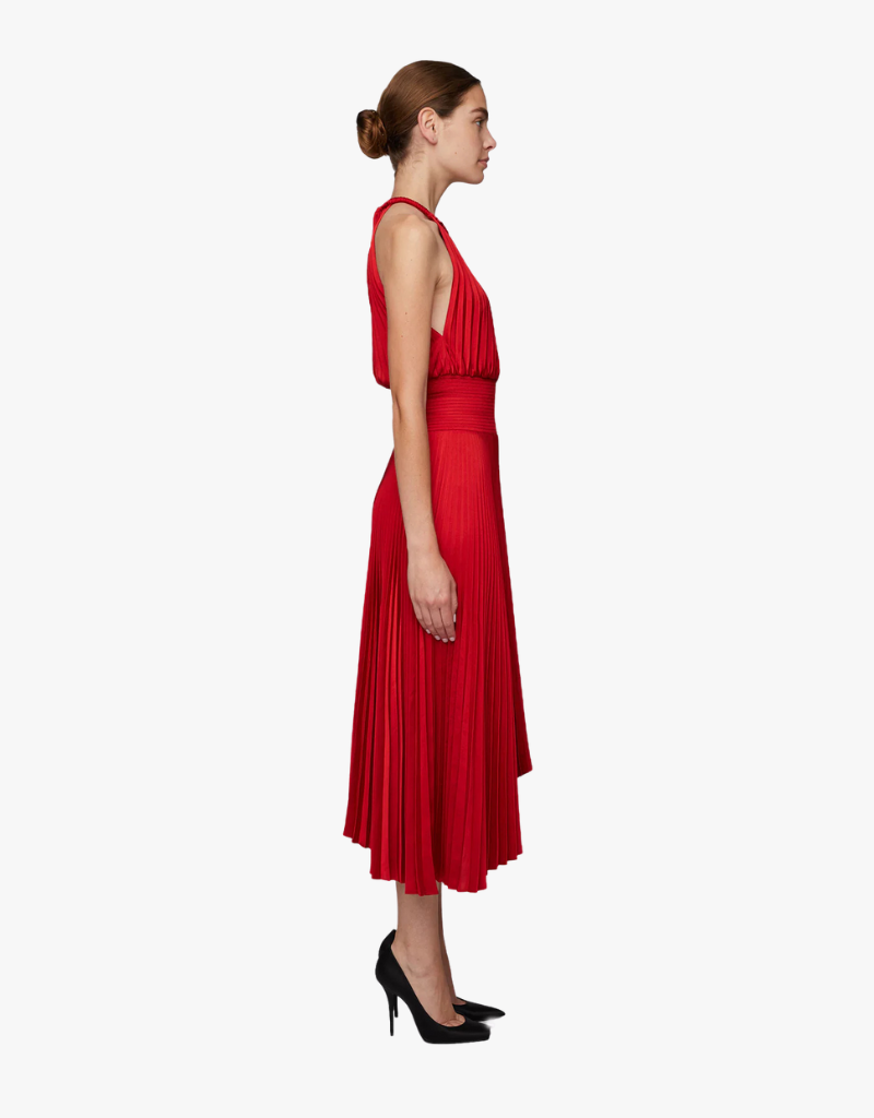The A.L.C. Renzo II Dress, part of the Signature Collection, is crafted from vintage satin in a rich Riviera blue. This midi dress features elegant all-over pleating, a chic halter neckline, and a flattering smocked waist.