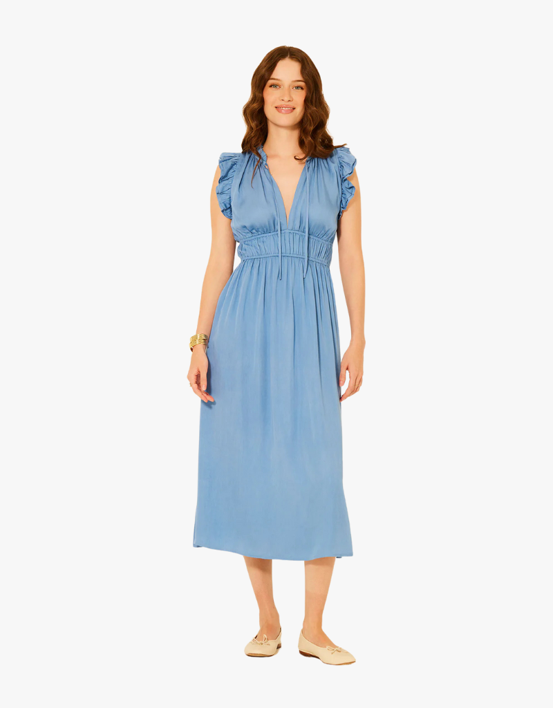 Flirty and flowy, the Paseo De Oro Dress is a perfect midi for any occasion. Featuring delicate flutter sleeves and a charming tie-neck, it brings playful elegance to your wardrobe.