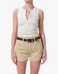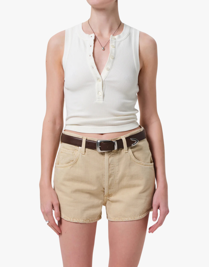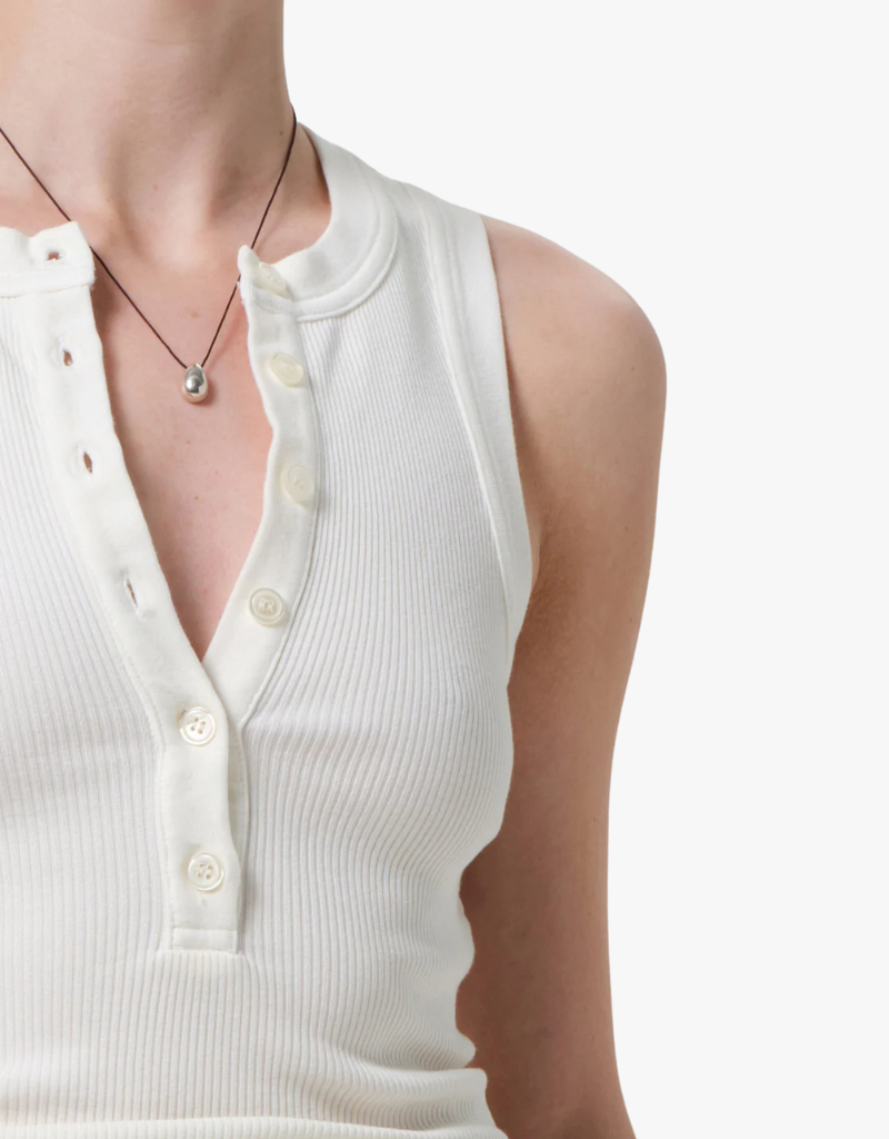 The Carolyn Tank is a button-front staple, crafted from signature rib fabric for a form-fitting silhouette. Perfect for layering with tonal pieces or wearing on its own, this versatile tank offers effortless style that works for any occasion. Pair it with high-waisted denim for a sleek, streamlined look or dress it up with a blazer for a more polished vibe.