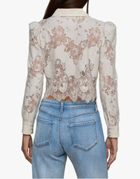 The Anita Lace Button Up by L’AGENCE is a romantic statement piece crafted from refined floral lace. Designed with a cropped silhouette, pointed collar, and scalloped hem, it blends timeless elegance with modern femininity. Puffed shoulders enhance its soft structure, making it perfect for pairing with denim or tailoring for an elevated finish.