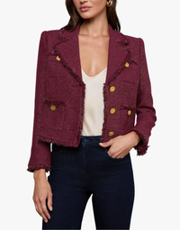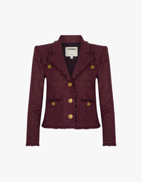 This refined collared jacket from L'agence elevates any wardrobe with its sophisticated malbec hue and shimmering gold accents. The Sylvia's luxurious fabric drapes beautifully in a timeless silhouette, while playful fringed edges and embossed gold buttons add distinctive character. A versatile piece that transitions seamlessly from day to evening, delivering understated elegance with modern flair.