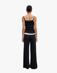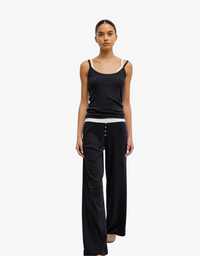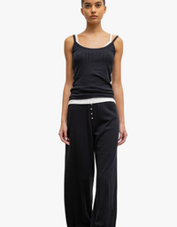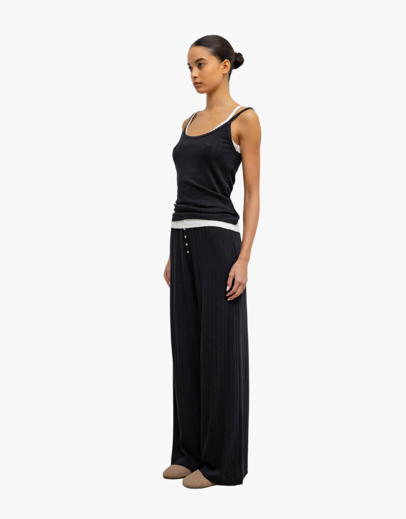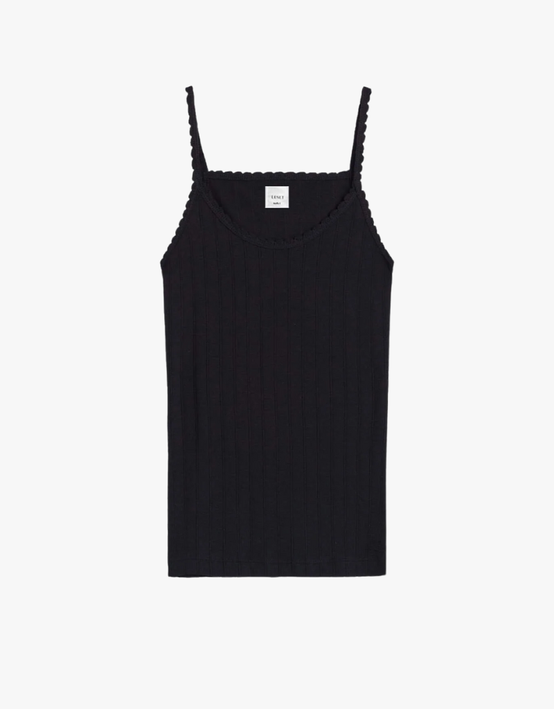 The Pointelle Tank Top is a timeless spaghetti strap piece crafted from pointelle cotton. Featuring pinhole stripes, eyelets, and scalloped trim, it’s perfect for layering or wearing solo for a chic look.