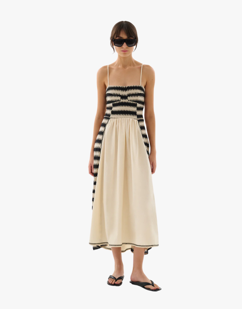 This airy midi dress is made from 100% knitted cotton for easy comfort. Featuring slender adjustable straps and a smocked back, it offers a personalized fit. The flowing skirt moves gracefully, while contrast stitching adds a handcrafted touch.