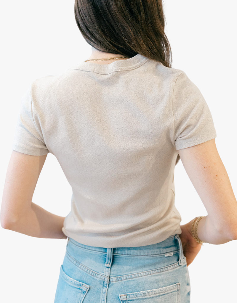 Effortlessly flattering and always in style, the Fallon Crew Neck Tee offers a form-fitting silhouette and a subtle sheen for added glamour. Take this piece from day to night!