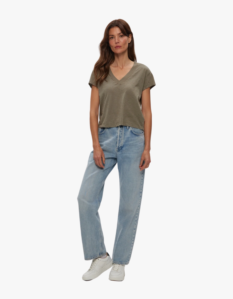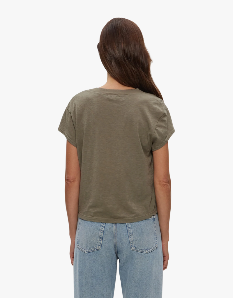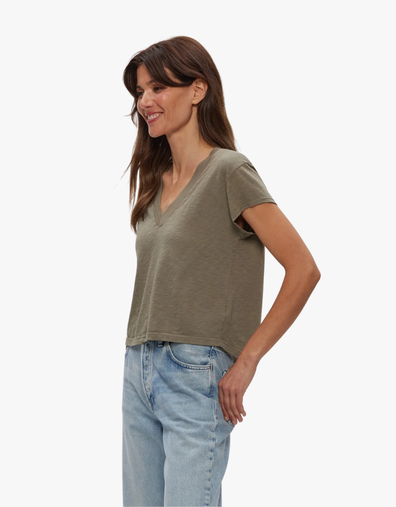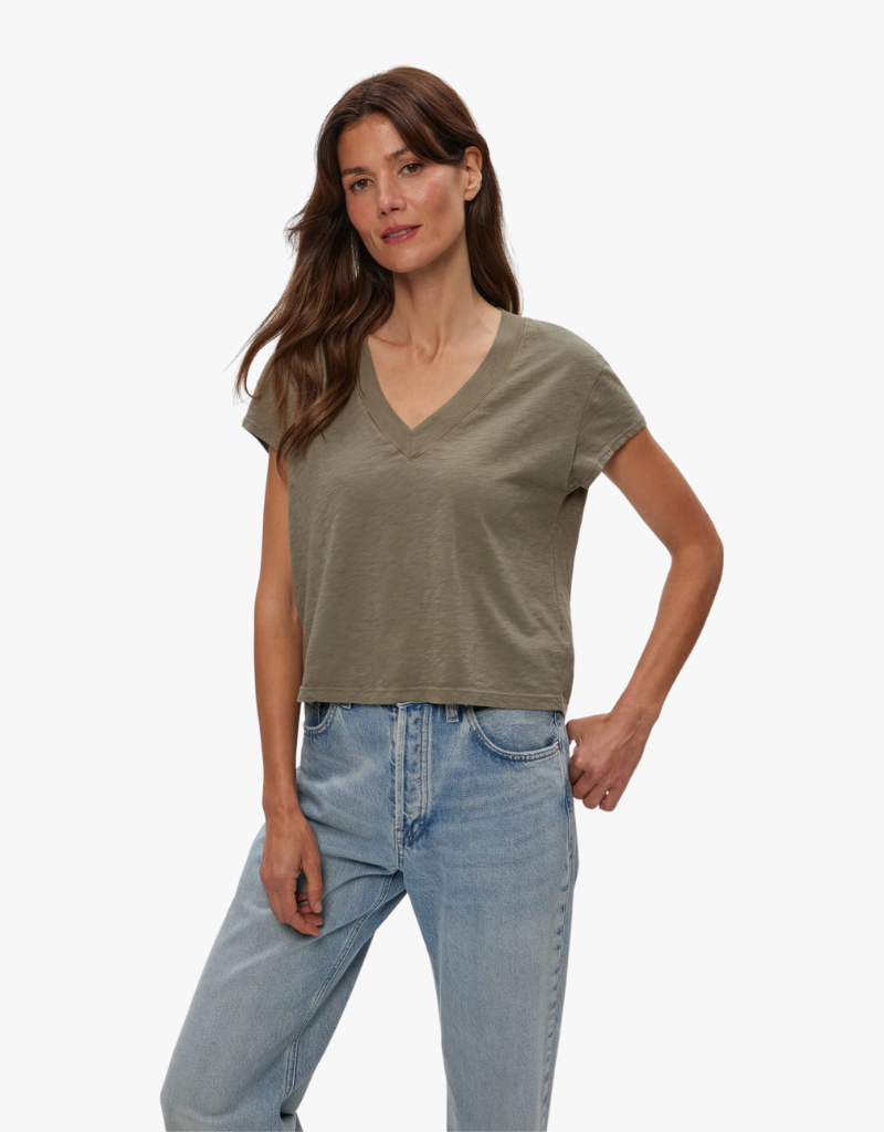 Michael Stars Harlan Cropped V-Neck Tee in Olive