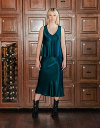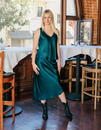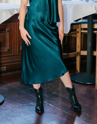 The Leila midi skirt is a sophisticated essential, featuring a bias-cut slip design that showcases a graceful flow. Made from locally produced satin in LA, this skirt combines a luxuriously soft Rayon and Viscose blend with a more sustainable manufacturing process than traditional polyester fabrics. Experience elegance with an eco-conscious touch.