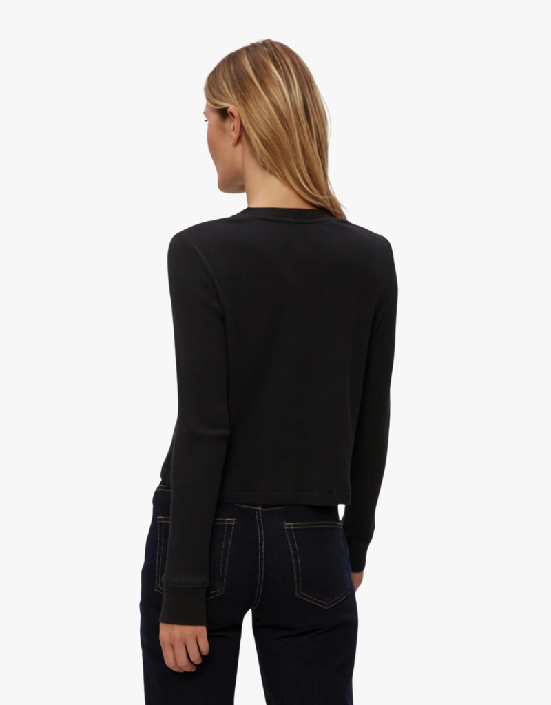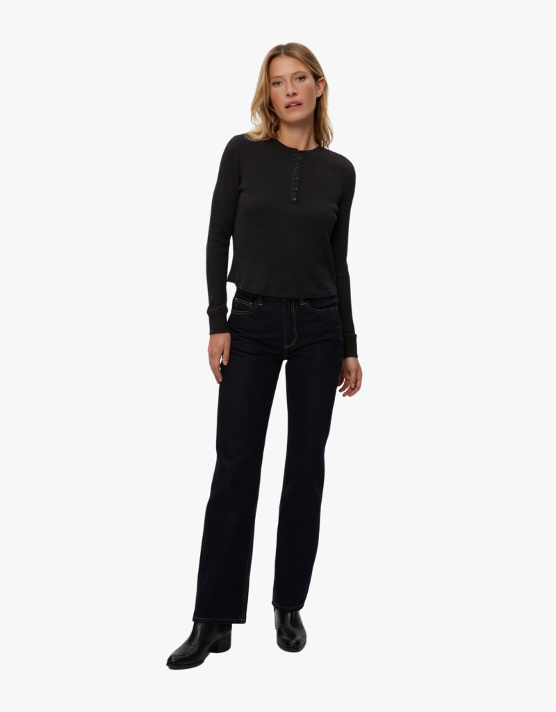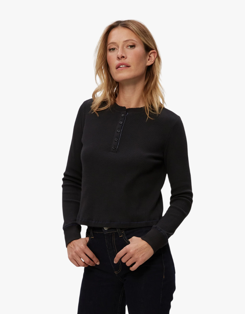 The Lina Thermal Henley Tee is the perfect layering piece. With a crew neckline, velvet tape inner closure, and contrast stitching, it’s crafted from heavier fabric, ideal under sweaters or jackets.
