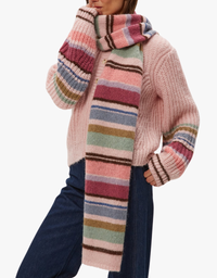 Wrap her in the plush softness of the soufflé knit striped scarf. Cozy and oversized, it adds instant warmth and effortless style. A winter essential—add to cart.