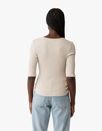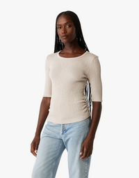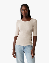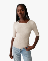 The Whitney Elbow Sleeve Tee is a wardrobe essential. Its fitted silhouette and soft crinkle knit fabric effortlessly transition from day to night, making it easy to dress up or down for any occasion.