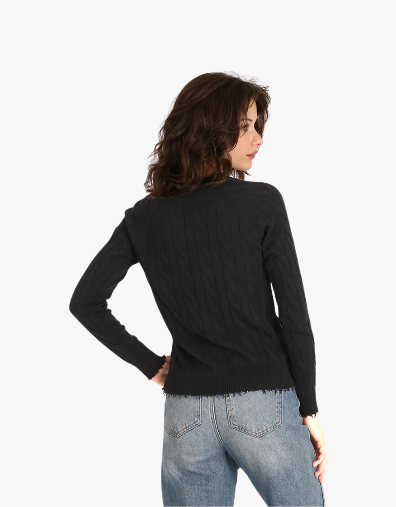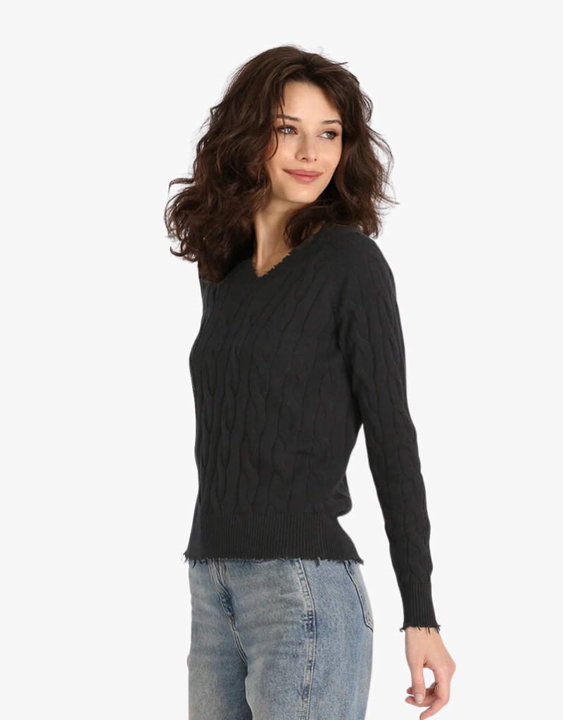 Minnie Rose Cotton Cable Long Sleeve V-Neck Sweater with Frayed Edges in Black