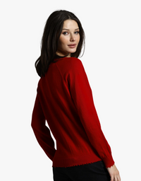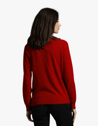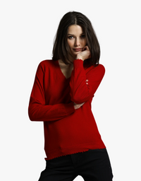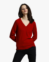 Minnie Rose Cotton Cashmere Frayed Edge V-Neck Sweater in Lava Red