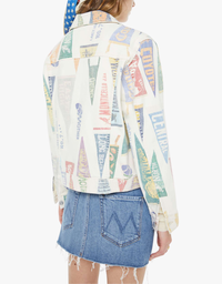 Defined by a sharp, boxy silhouette, this structured jacket is reimagined with an intricate, multi-tonal pennant motif. Meticulously tailored from premium mid-weight cotton to maintain its architectural form, the piece features traditional silver-tone hardware and classic chest flap pockets.