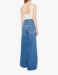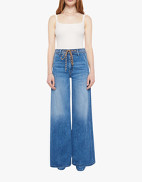 These playful, high-rise, wide-leg "Riddle Me That" jeans feature a long 32-inch inseam, zip fly, clean hem, and a unique, colorful drawstring waistband, crafted from stretch denim with subtle whiskering and knee fading.