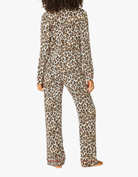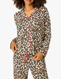 Make a bold statement with this striking modal jersey pajama set, featuring an all-over leopard spot pattern for undeniable style. The button-down top showcases red piping and buttons, while the relaxed drawstring pants tie with a matching red ribbon for a coordinated look.