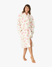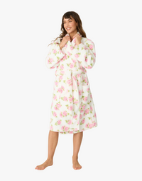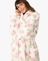 Stop and smell the cozy roses. Soft pink blooms bring vintage charm to this ultra-soft fleece robe. Its plush, nubby texture wraps you in hug-like warmth, while the relaxed wrap silhouette, roomy sleeves, and self-tie belt make comfort effortlessly chic.