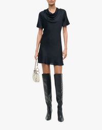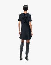 The Iris is an elegant silk mini dress designed for versatile styling—dress it up or keep it casual. It showcases a flattering cowl neckline, delicate short flutter sleeves, and a tie detail at the back for a touch of sophistication.