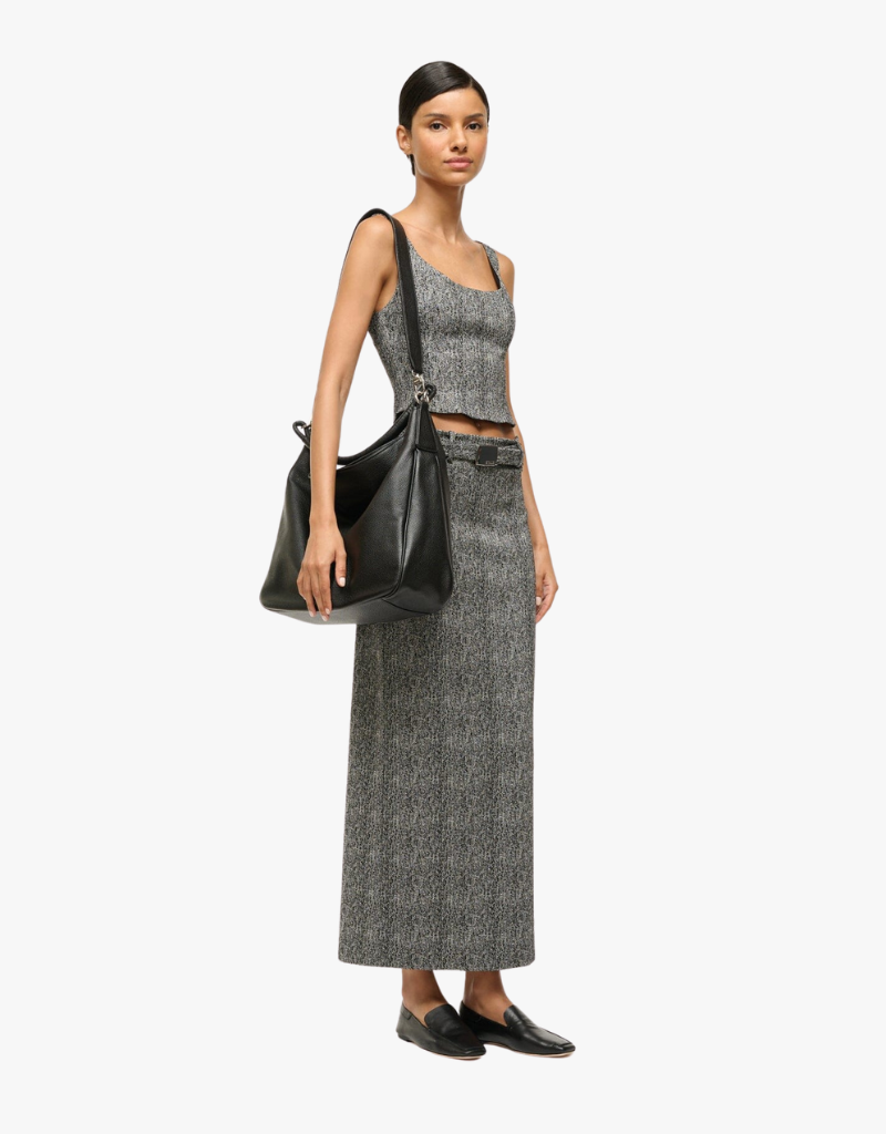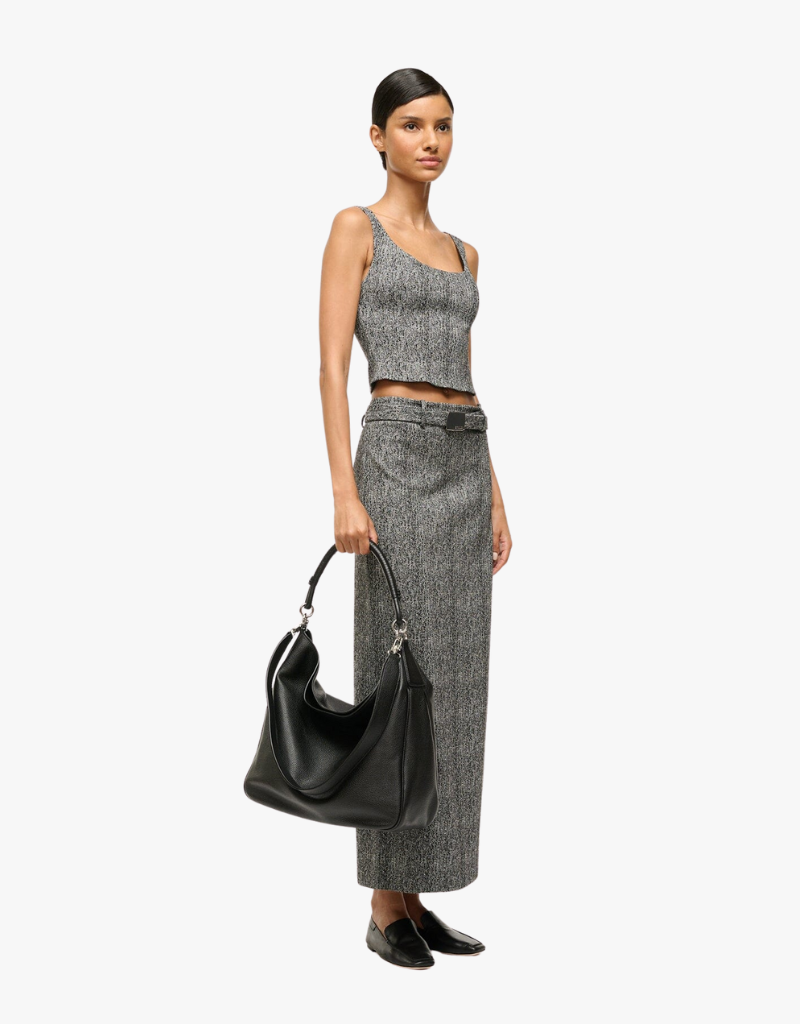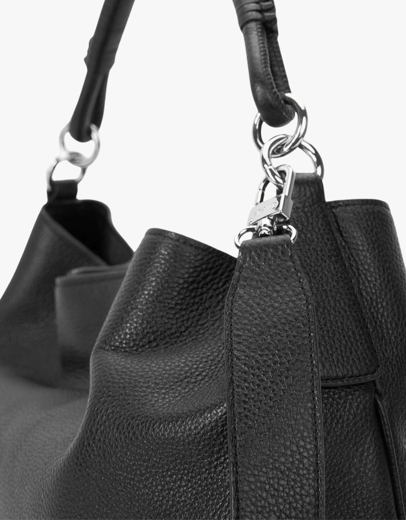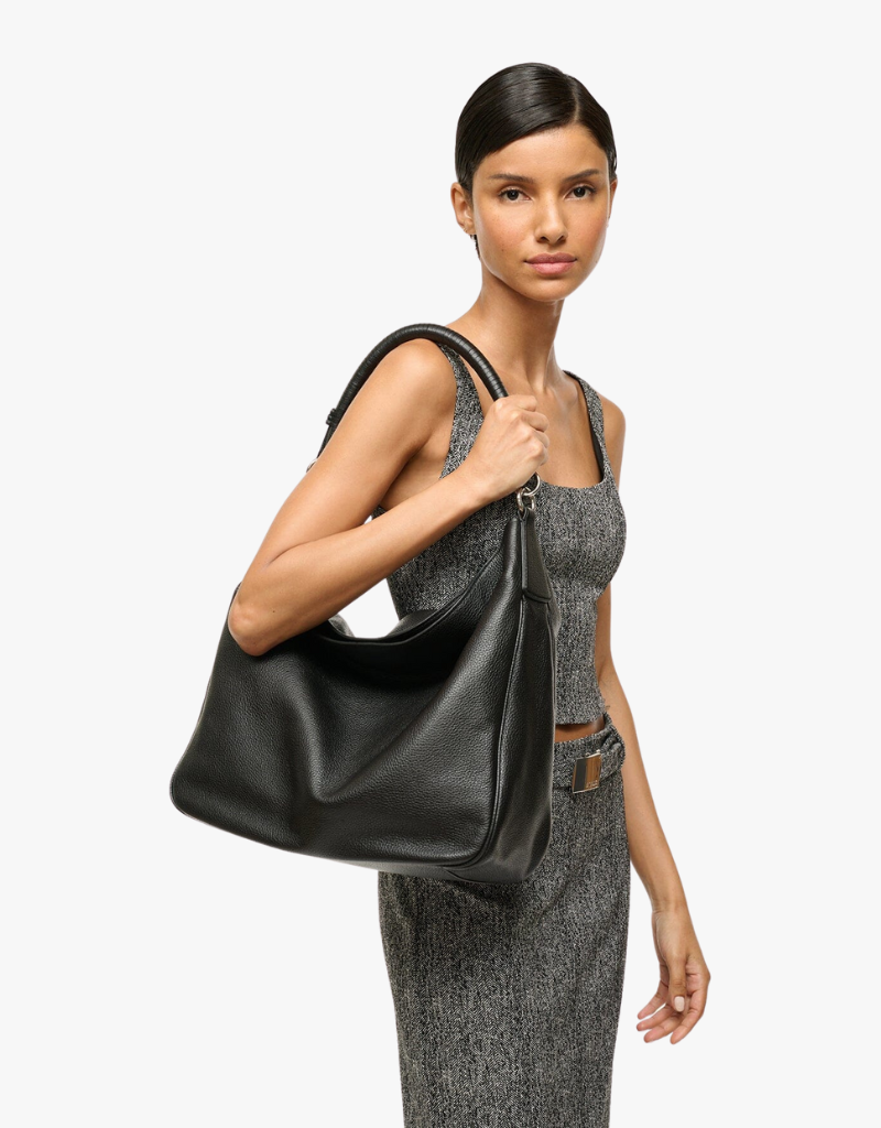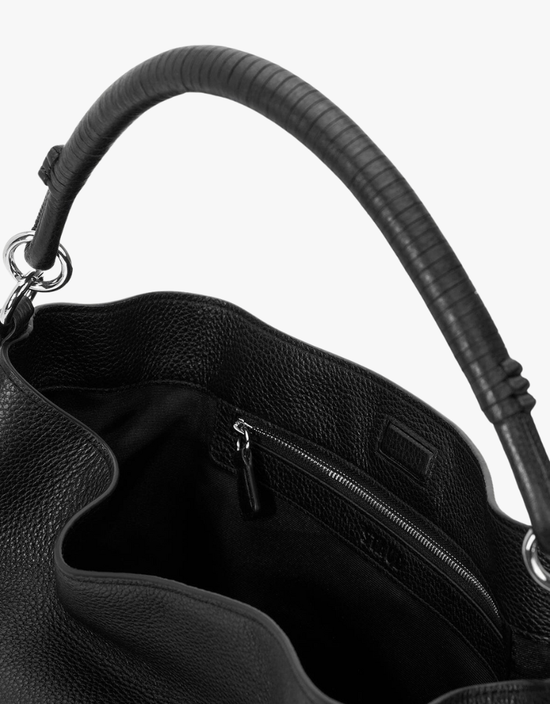 Introducing the Perry Bag - a slouchy tote with a wrapped leather handle, a removable shoulder strap, and a magnetic closure. The luxurious suede lining adds a touch of sophistication to this must-have accessory. Indulge in sophistication!