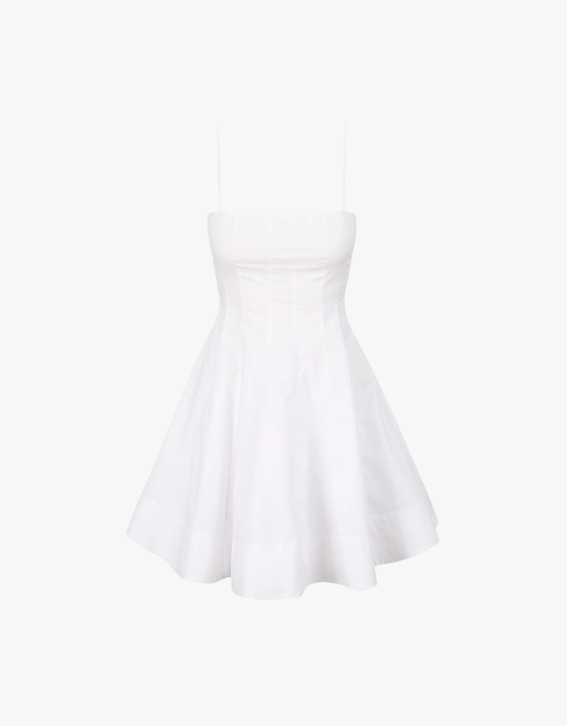 Check out the Wylie Mini Dress, crafted from signature cotton poplin. With a corset-style panel, spaghetti straps, and a straight neckline, it radiates timeless charm.
