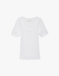 The Baby Rib Ballet Tee offers a modern twist on classic 1930s cotton undershirts, designed with a feminine touch. It showcases a scooped neckline, fitted short sleeves, and a wide, fine ribbed texture. Crafted from lightweight baby rib fabric, this tee fits closely with just enough stretch for ultimate comfort and enduring style.