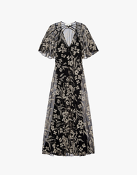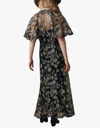 A modern take on 1930s romance, this printed mesh dress flatters with a slim fit, empire waist, and flowing skirt. Flutter sleeves and delicate seaming add graceful movement, while the removable slip ensures effortless wear. A timeless piece for any occasion—shop now!