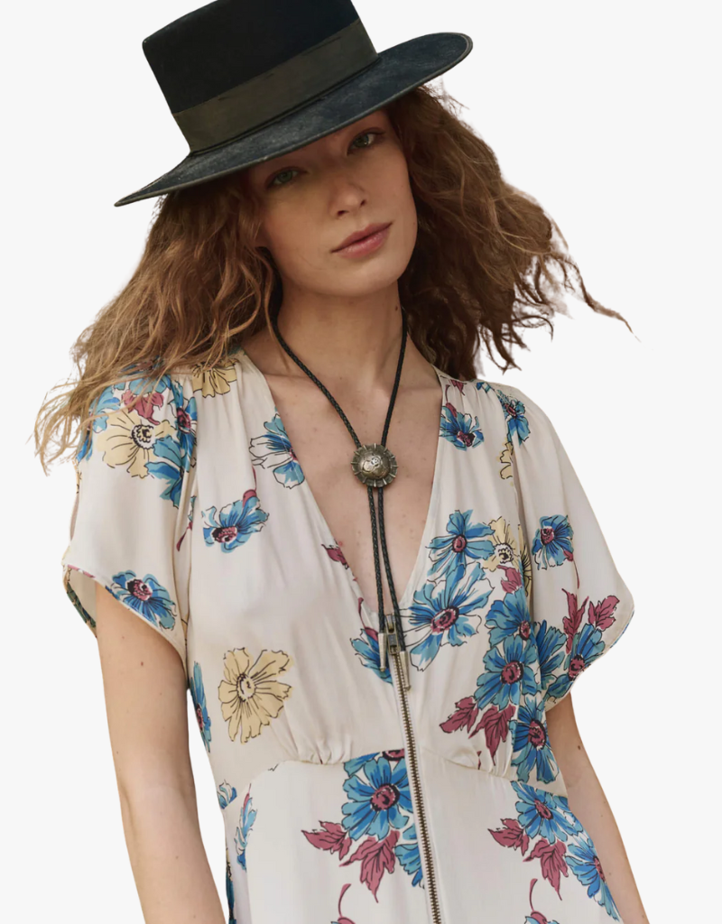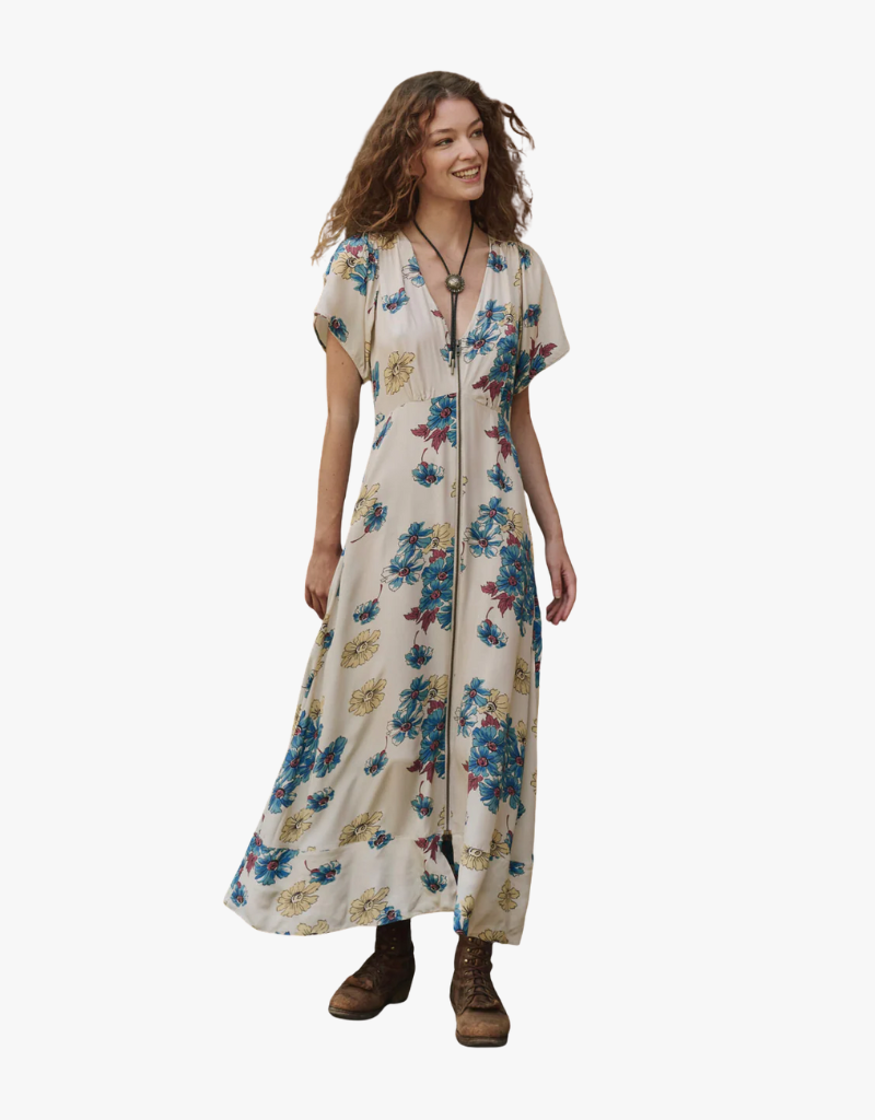 The Laurel Dress blends everyday ease with romantic flair. Its angled waist seams and deep V-neck create an elegant silhouette, complemented by a front metal zipper that adds a subtle industrial touch. Perfectly styled with vintage washed denim, this dress delivers a look that is both classic and modern.