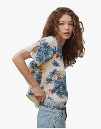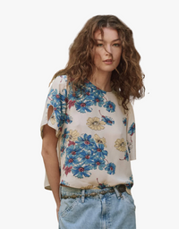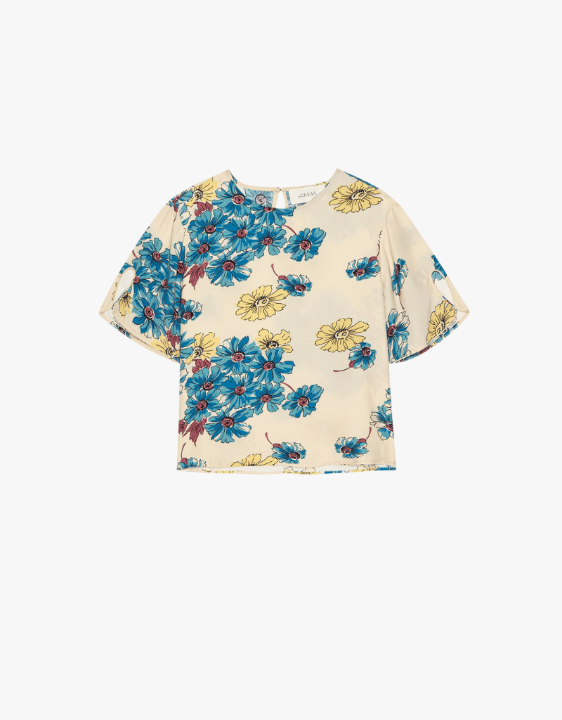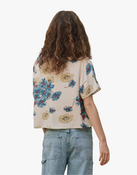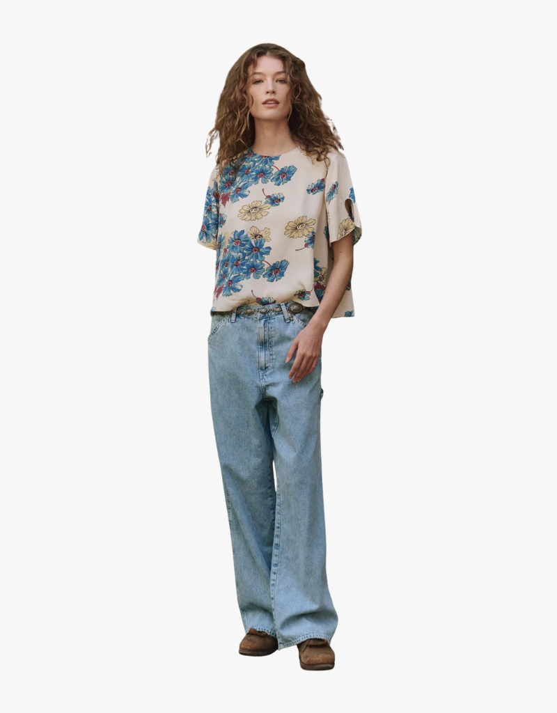 The Mandolin Top in Sungold Floral offers effortless style with its relaxed fit and classic crew neckline. Its boxy shape and loose short sleeves, accented by subtle piped edges, showcase careful attention to detail. This versatile top complements your favorite worn-in jeans, creating a look that’s both timeless and modern.