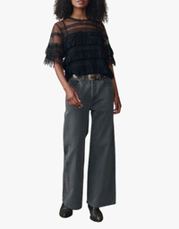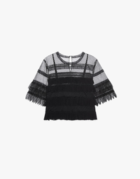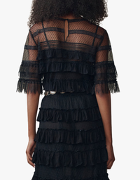 Whimsical and light, this top layers dotted mesh, bobbin lace, and soft georgette ruffles for a vintage-inspired feel. With delicate edges and a loose, boxy shape, it moves beautifully with every step. Sheer and airy with a back button closure and separate camisole—a romantic piece to make yours today.