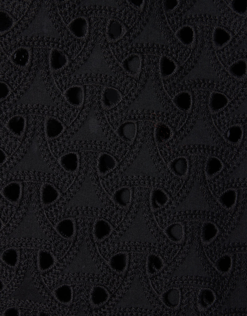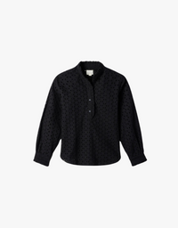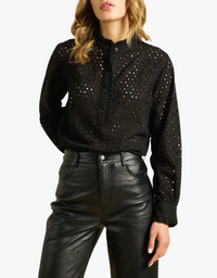 Discover our Breezy Blouse, showcasing a ruffled high neck and elegant front trim, plus matching cuffs. Available in Black Eyelet, it's made from soft cotton eyelet for a touch of elegance.