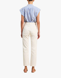 A feminine blouse designed with soft gathers at the front and back for subtle volume and movement. The slightly cropped silhouette features short side slits and signature antique white buttons for a refined finish. Crafted from crisp cotton poplin, it’s a lightweight piece that pairs effortlessly with denim, shorts, or skirts.