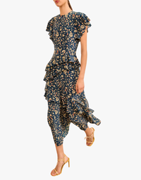 The Amaia Dress, crafted from silk crepe de chine, features a floral batik print in fluid, multicolored tones. With flutter sleeves and tiered ruffles cascading from the waist, it exudes effortless, poetic elegance—add it to your wardrobe today.