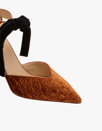 Discover the Corinna Heel, an Italian-crafted masterpiece in luxurious Sierra brown velvet elevated by intricate crocodile embossing. The refined point-toe silhouette showcases a sophisticated d'Orsay cut with supple leather lining, while a striking velvet bow adorned with brass eyelets delivers an unmistakable statement of elegance. A timeless investment piece that transforms any ensemble.