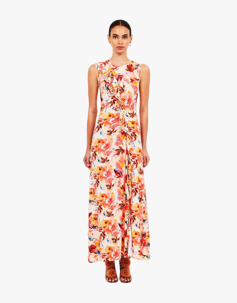 Discover the elegance of the Elise Dress. Crafted from soft tissue-weight jersey, it features vibrant layered blooms, cascading ruffles, and a split hem for effortless movement—perfect for every fashion lover!